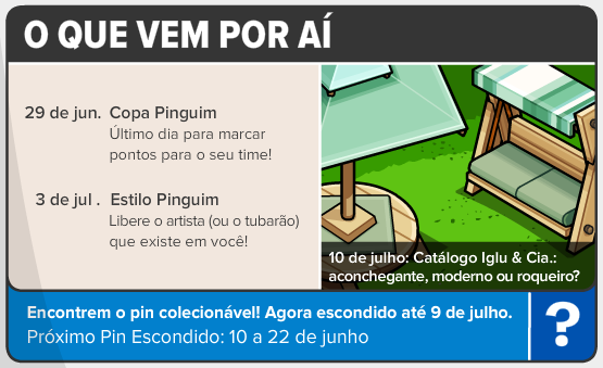 Tal como em outros jornais lançados recentemente, o Fim da Copa Pinguim e o lançamento do próximoCatálogo Estilo Pinguim, são os únicos acontecimentos próximos na ilha. Como novidade, temos o lançamento do próximo Catálogo Iglu & Cia, que trará certamente, novos itens musicais para os nossos iglus.